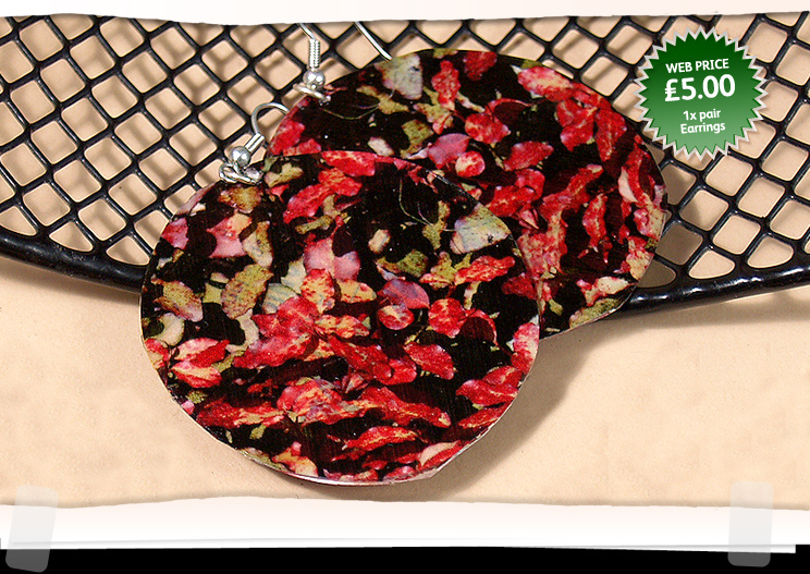 Card/print round drop earring. Mixed green, red, blue