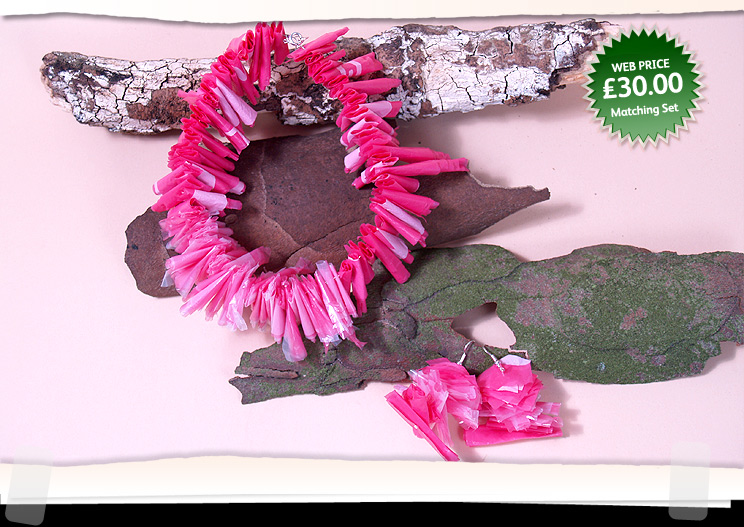 Plastic bag choker style necklace & earrings. Shocking pink/light pink
