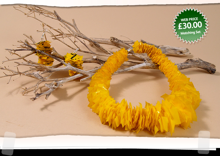 Plastic bag, choker style necklace & earrings. Necklace bright yellow, earrings bright yellow/black